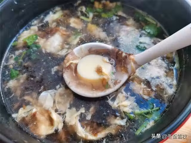 7.關小火,轉圈淋入雞蛋液,待蛋液變得稍凝固,把蛋液攪散開,成雞蛋花,加入鹽調味,再加入白鬍椒粉,香油,香菜段即可,一道色香味俱全的紫菜日本豆腐雞蛋羹就做好了。