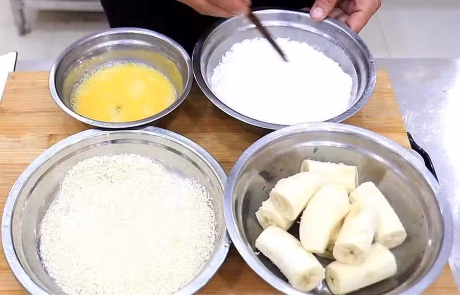 把香蕉先裹上蛋液再裹上澱粉,再裹一層蛋液再粘上麵包糠,這樣處理炸的時候不易脫漿,炸出來更加焦酥。