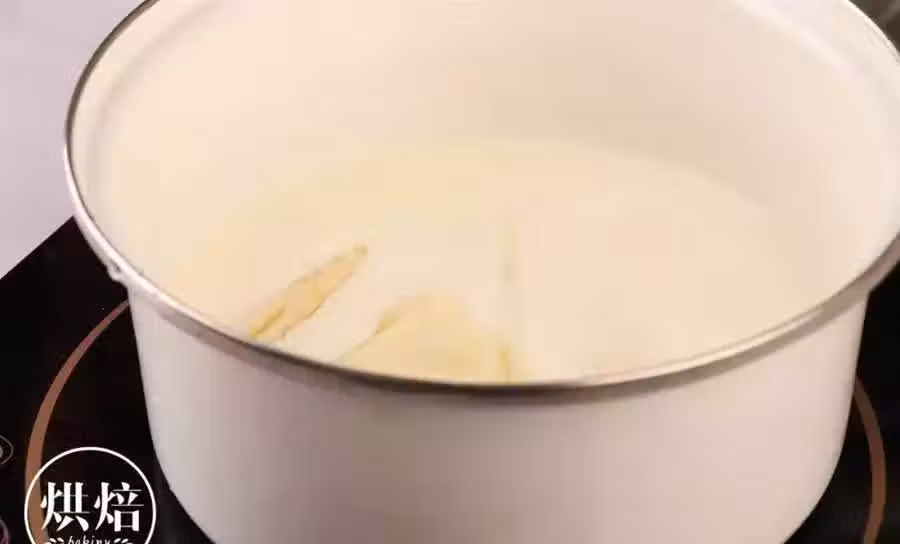 倒入蛋黃液,攪拌均勻,加熱至80度,關火。