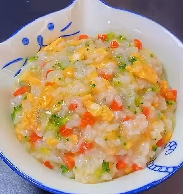 步驟三:先把胡蘿蔔丁下鍋炒熟,炒出胡蘿蔔的香味,然後加入適量的煮好的白米粥,煮5分鐘,再把雞蛋碎下鍋,煮一會兒,再把西蘭花碎下鍋,加點鹽,攪拌均勻就可以開吃了。吃的時候加點肉鬆,特別下飯。