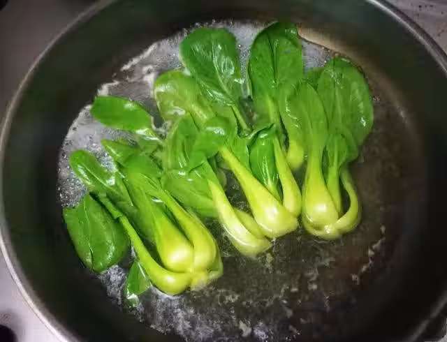 鍋中加入適量的水,煮到馬上要開的時候,在水中加入一勺油,將青菜放入鍋中焯水30秒,然後撈出放入涼水中冷卻後瀝干水分。這一步是去除青菜的澀味,也可以減少炒制的時間,加油是為了讓青菜炒出來顏色更加翠綠好看,增加食慾。
