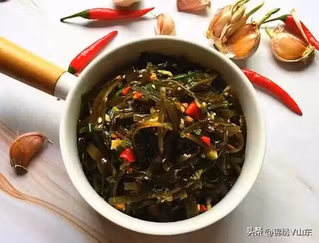 1:海帶切片,水燒開下鍋煮5分鐘,撈出過涼水。大蒜切片,小米辣切碎。