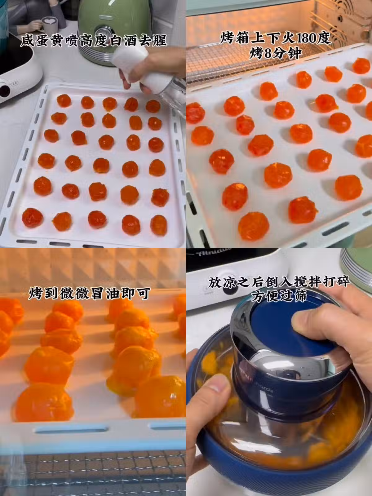 1️⃣鹹蛋黃噴高度白酒去腥,烤箱上下火180度烤8分鐘,烤到微微冒油即可