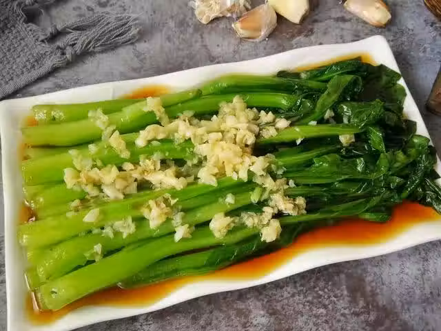 食材:菜心1把,蚝油1勺,生抽1勺,大蒜適量,食用油適量,鹽1勺。