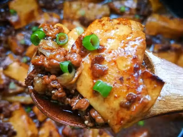 食材:豆腐1塊,牛肉末100克,蔥、姜、花椒適量,紅油豆瓣醬1勺,生抽1勺,老抽1勺,白糖小半勺。