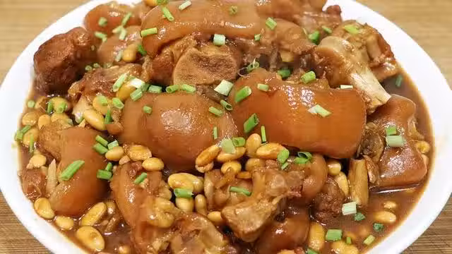 材料:豬手 半隻,生抽 3勺,老抽 1勺、黃豆 40克,冰糖 2小塊,料酒 1勺、生薑 2片,大料(八角 1個,香葉 1片,桂皮 1小片,草果 1個)