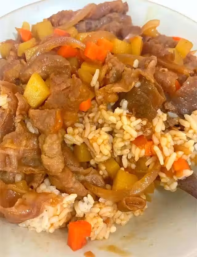 步驟三:鍋中倒油,把胡蘿蔔、土豆下鍋炒至斷生,放入洋蔥、肥牛,倒入料汁,倒入料汁燜煮至濃稠即可,
