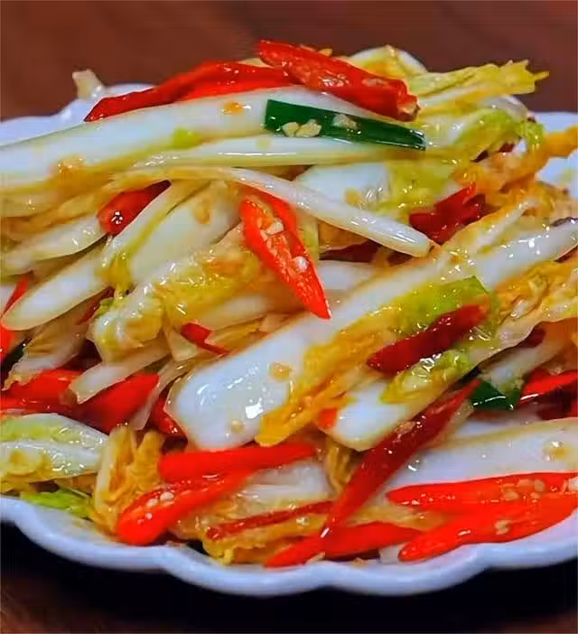 步驟三:娃娃菜中加蔥段、蒜末、小米辣、適量鹽,淋上一勺熱油,再加一勺蚝油、一勺花椒油、一勺生抽、一勺辣椒油,一勺陳醋,辣椒油按照自己口味添加,抓拌均勻即可,酸辣開胃。