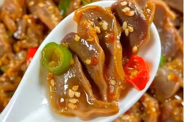 步驟三:雞胗裡面倒入料汁,香菜碎、青紅辣椒,拌勻即可。