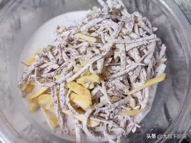 2、接著放入芋頭簽和地瓜簽至粉漿中攪拌均勻。倒入有抹上薄薄一層的沙拉油的透明玻璃容器內。(儘量將芋頭和地瓜簽稍微下壓,讓粉漿浮在最上面,這樣等等蒸好的簽粿才會漂亮)