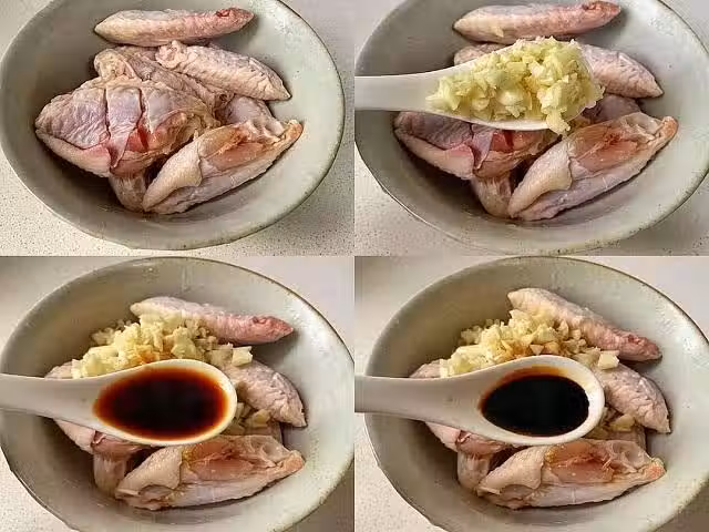 (1)買回的雞翅用清水沖洗幾次,洗去血水和雜質。在雞翅兩面劃一些深的口子,並用刀背輕微捶打幾下。加入蒜末,生抽,老抽,陳醋,食鹽,椒鹽和白糖,用筷子拌勻。