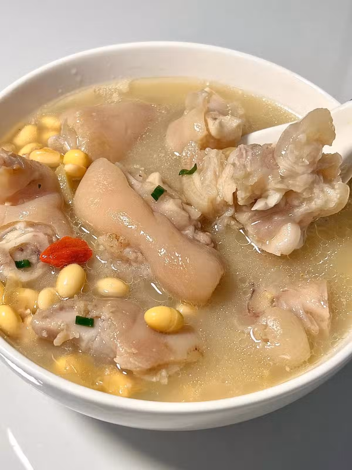 2:豬蹄 黃豆轉砂鍋中一次性加足水(加開水湯才會白),再放幾塊薑片,轉最小火燉兩個小時或放入電飯煲煲1小時左右出鍋前加適量枸杞鹽雞精調味.