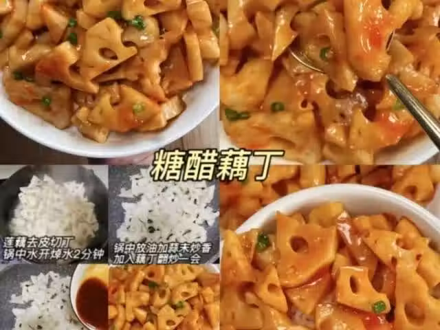 蓮藕去皮切丁,鍋中水開焯水2分鐘,鍋中放油加蒜末炒香加入藕丁翻炒一會兒,倒入糖醋汁翻炒,撒上蔥花就可以吃了。