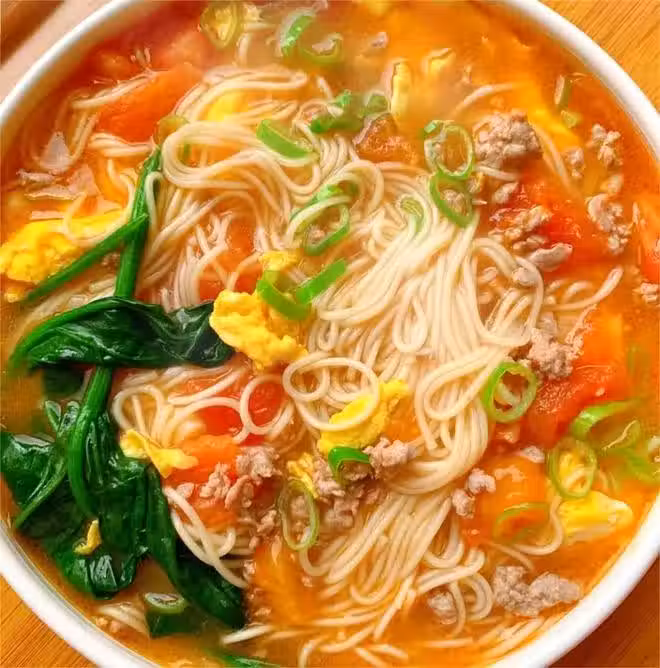 步驟三:鍋中燒熱,先把蔥花下鍋炒香,再下入西紅柿塊炒軟,加一點鹽更容易炒出汁,放兩勺生抽、一勺蚝油、兩碗開水,水開後下面,加入腌好的肉末、雞蛋,按照自己口味調味即可,出鍋前燙一下青菜,撒點蔥花就好啦!早餐或者下班回來,十分鐘就好。