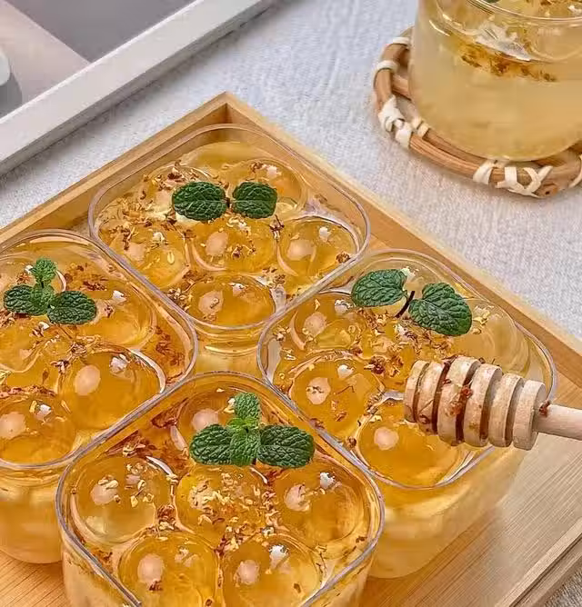 桂花茉莉茶凍:干桂花茶包用開水泡出顏色,濾出茶包和桂花,倒入白涼粉攪勻,入模具冷藏定型。