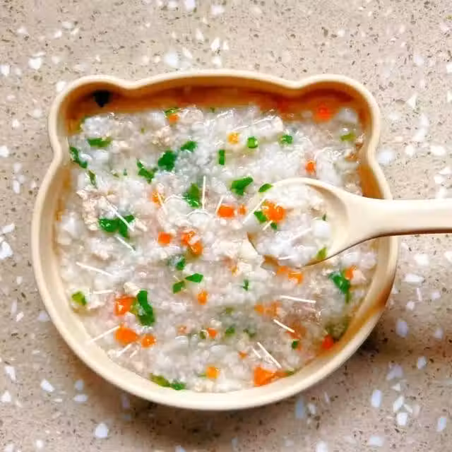 鍋中熱油倒入肉末翻炒變色,倒入胡蘿蔔碎翻炒一會,倒入提前煮好的山藥、大米粥熬煮至濃稠