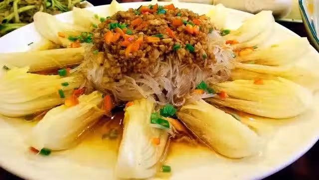2、粉絲煮熟,把粉絲放到熟了的娃娃菜上面,擺好造型。