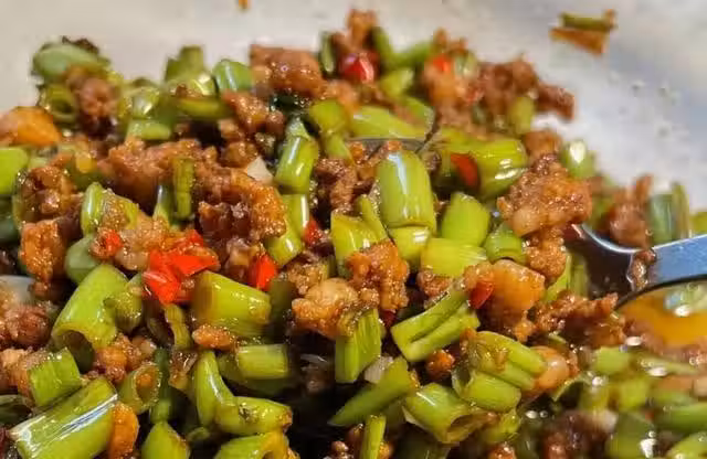 3.放入空心菜杆 、1勺鹽、1勺生抽: 大火快速翻炒30秒左右十一點點陳醋提味、翻炒。出鍋前加少許雞精調味即可