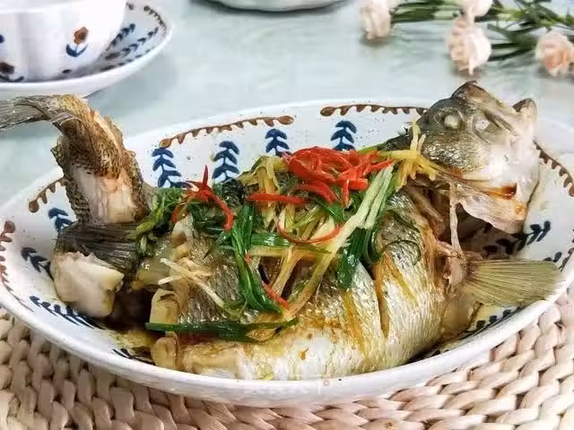 4、時間到,倒去蒸出的魚汁,魚上撒蔥絲、薑絲、辣椒絲。