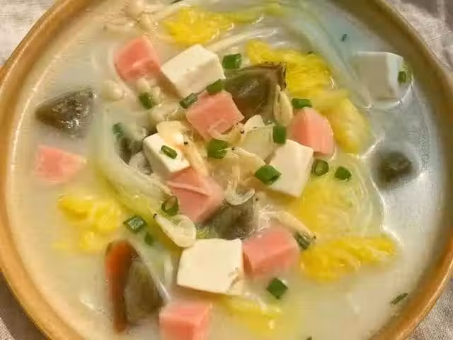 娃娃菜、皮蛋、豆腐、金針菇、火腿、蝦皮、蔥花、蒜末、薑末、食用油、香油、食鹽、清水
