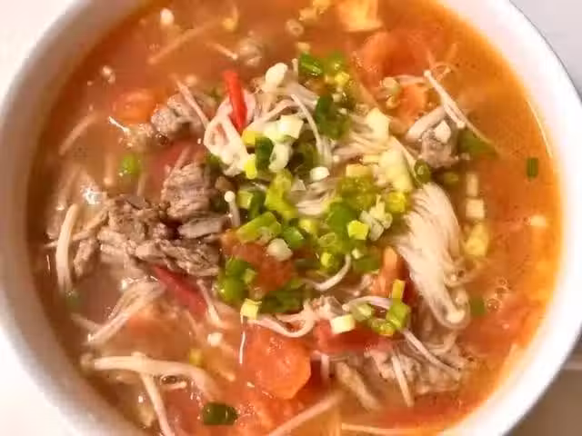 金針菇、番茄、牛肉、蔥花、蒜末、食用油、蚝油、生抽、料酒、食鹽、雞精、清水