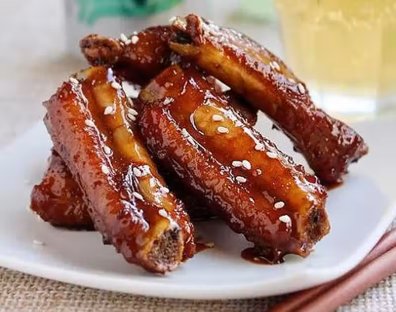 豬肋排500g、洋蔥15g、生抽20ml、米酒15ml、蜂蜜15ml、冰糖10g、醋15ml、鹽少許、白芝麻少許