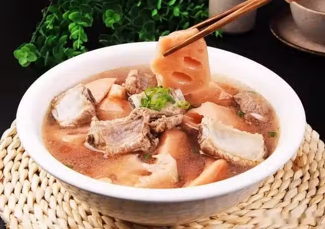 【製作步驟】煲湯建議選擇紅花藕,粉藕,其口感粉糯,尤其適合煲湯。排骨洗凈,冷水下鍋;加薑片和料酒焯水後撈出;另起鍋倒油,下蔥姜爆香,倒入排骨翻炒至變色;倒入三倍食材的開水,大火燒開,放入洗乾淨的蓮藕(切成滾刀狀);水開轉文火熬制1-2個小時,時間到了以後,藕粉湯濃,最後出鍋前簡單放少許食鹽調味即可。