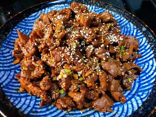 2、牛肉片加入除食用油和芝麻之外的所有調料,多抓一會兒,抓勻。