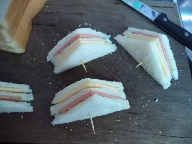 牙籤是用來固定三明治的,家裡有太小的小朋友,建議取消牙籤,怕不小心扎到孩子,可以改用沙拉醬來做粘合作用,味道同樣的好。