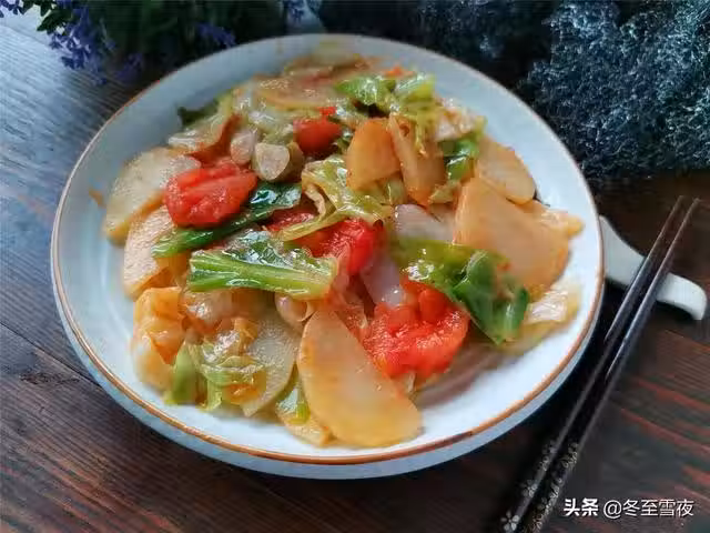 【西紅柿土豆炒包菜】所需材料:包菜半顆、西紅柿1個、土豆1個、油鹽適量、蔥1段、姜1片、大蒜2瓣、
