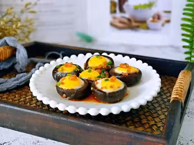 3.焯水的香菇擺放在盤子裡,再磕入鵪鶉蛋。