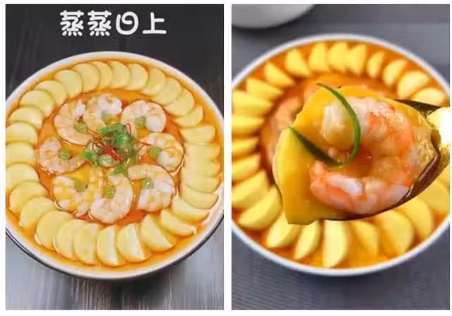 3.燒一鍋水,水開後,準備入鍋蒸,蒸7分鐘,取出豆腐,鋪上蝦仁,再蒸4分鐘。