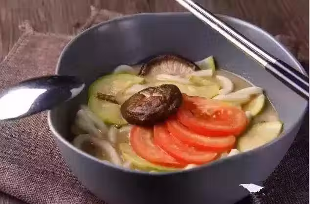 烏冬面,西葫蘆,西紅柿,干香菇,鮮香菇,薑絲,花生醬,生抽,植物油