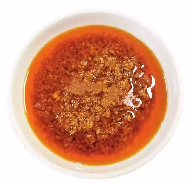 製作 1. 將麻椒、花椒、朝天椒分別放入烤箱烘乾,一起磨成混合粉 ;鍋內放入鹽炒熱,放入混合粉、海米粉炒香。2. 鍋內倒入蒜油,燒至八成熱時,放入生、熟蒜蓉炒香,再放入炒好的粉、蚝油、黃油、白糖、鹽拌勻即可