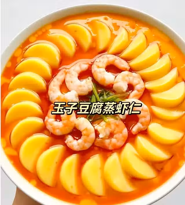 第四步,擺上提前腌制好蝦仁,再蒸5分鐘,淋上香油,生抽,擺上蔥花。