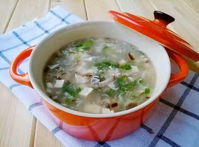 4.將香菇、豆腐、薑片,放入鍋中,倒入適量清水煮開;再放入牛肉煮開;加入調好的水澱粉勾芡,煮至湯水變濃稠,(水澱粉不要一下子全倒進去,先倒入一些,感覺不夠濃稠再倒入剩下的);