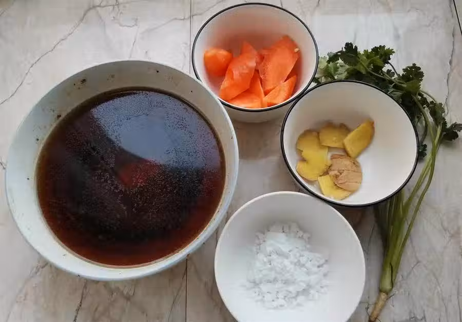 1.炸過魚和蝦的油,聞著有腥味,看起來顏色重還渾濁,準備好洗油的調料,洋蔥小半個、姜4-5片、胡蘿卜1段、香菜1棵、花椒10幾粒、大料2個、澱粉2-3湯匙,把姜切成片,姜用帶皮的邊角料就可以,中間的部位做菜吃,這樣不會浪費。胡蘿卜切成滾刀塊。