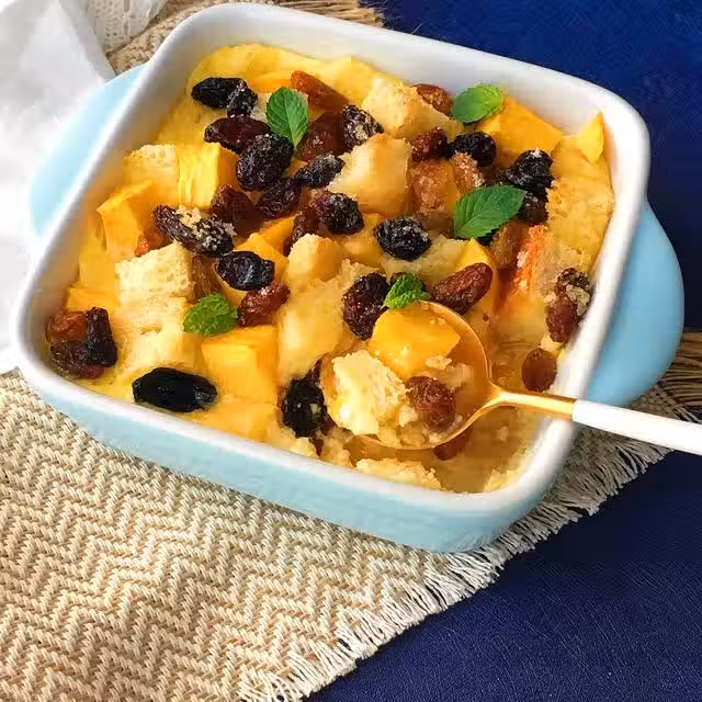 3將黃桃與麵包丁放入烤碗,加入蛋奶液,放上葡萄乾,撒上細砂糖。