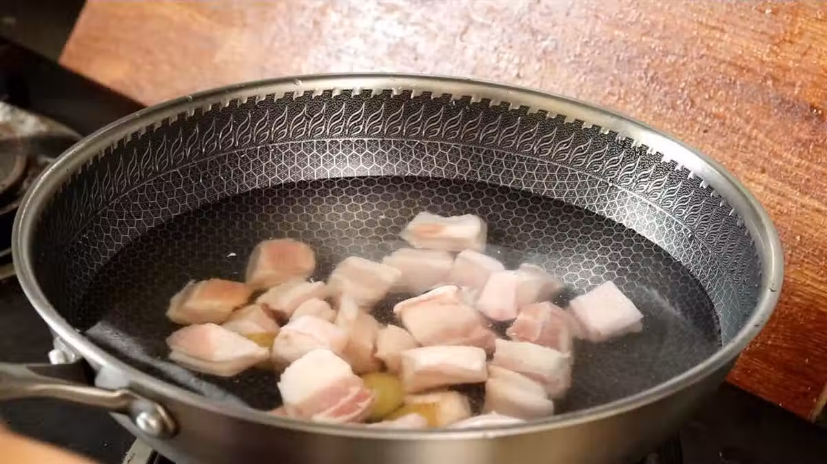 將豬肉涼水下鍋,放入切好的薑片,蔥段,倒入料酒,大火燒開,燒開之後撇去表面的浮沫,然後將豬肉撈出,用涼水沖洗去掉表面的雜質,控水備用