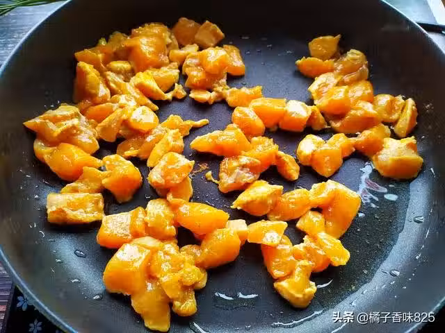 5、調料都加進去以後,翻炒均勻,讓每一塊雞胸肉都蘸滿調料,這樣吃起來才更好吃,更過癮。