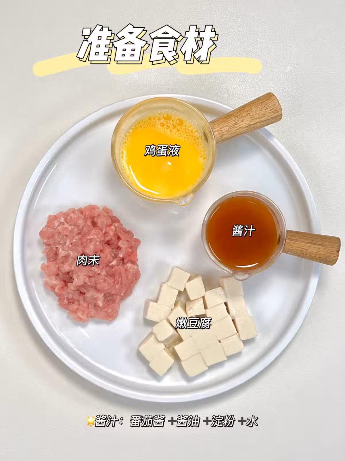 準備食材:嫩豆腐 肉末 雞蛋 蔥花。醬汁:番茄醬 醬油 澱粉 水