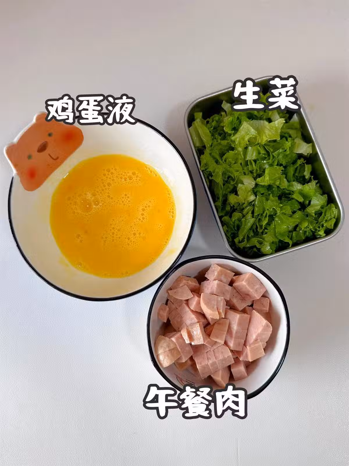 2、熱鍋燒油,下入午餐肉煎至兩面金黃,然後倒入炒好的雞蛋,加入一勺生抽,一勺蠔油,倒入適量的剩米飯翻炒均勻。