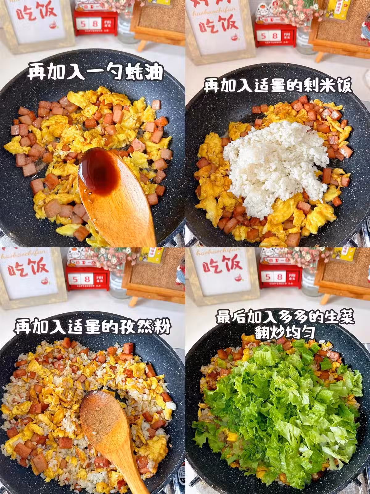 2、熱鍋燒油,下入午餐肉煎至兩面金黃,然後倒入炒好的雞蛋,加入一勺生抽,一勺蠔油,倒入適量的剩米飯翻炒均勻。