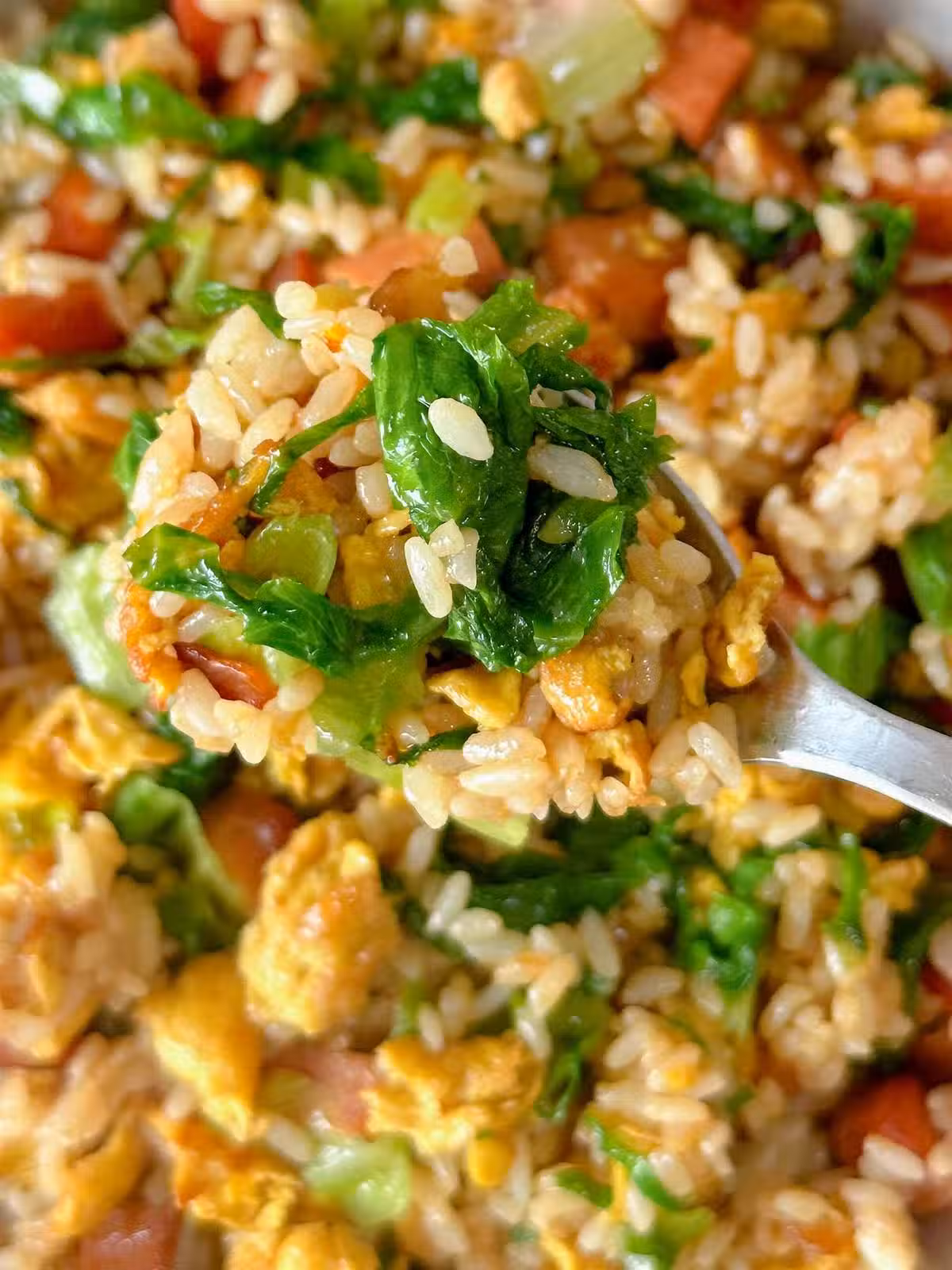 3、再加入一勺孜然粉,最後倒入多多的生菜,翻炒均勻就完成了✅