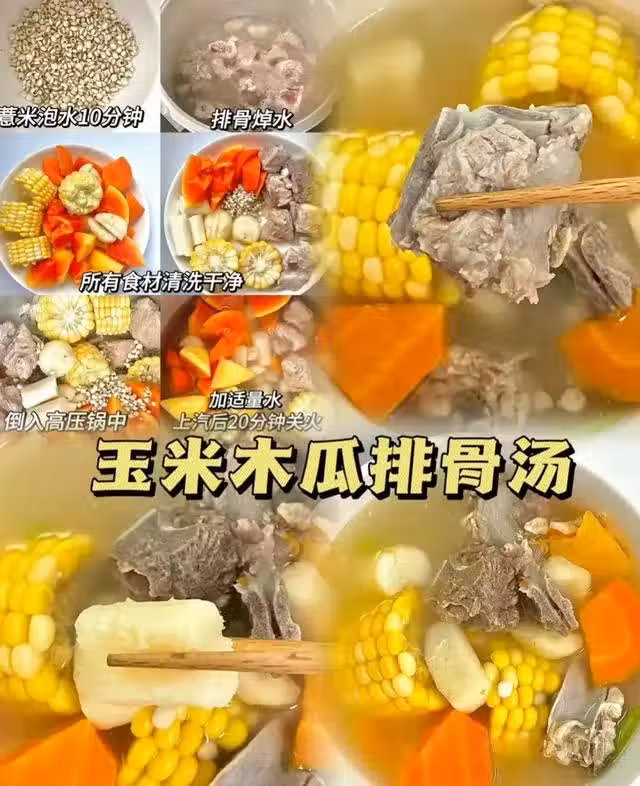 把排骨下料酒姜蔥焯水,撇掉浮沫,洗乾淨所有食材,加入高壓鍋中,煮20分鐘即可!
