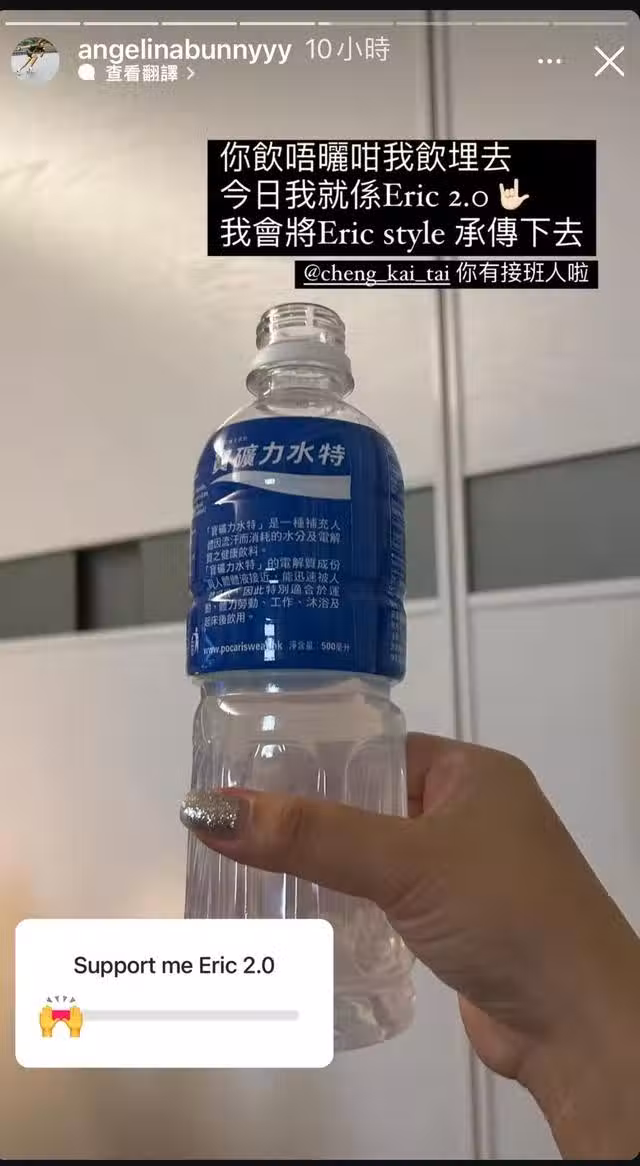 王雁芝貼出一張手持飲品照片並寫道:「你喝不完那我喝掉,今日我就是Eric 2.0,我會將Eric style承傳下去。」她tag了鄭啟泰ig並寫「你有接班人啦。」