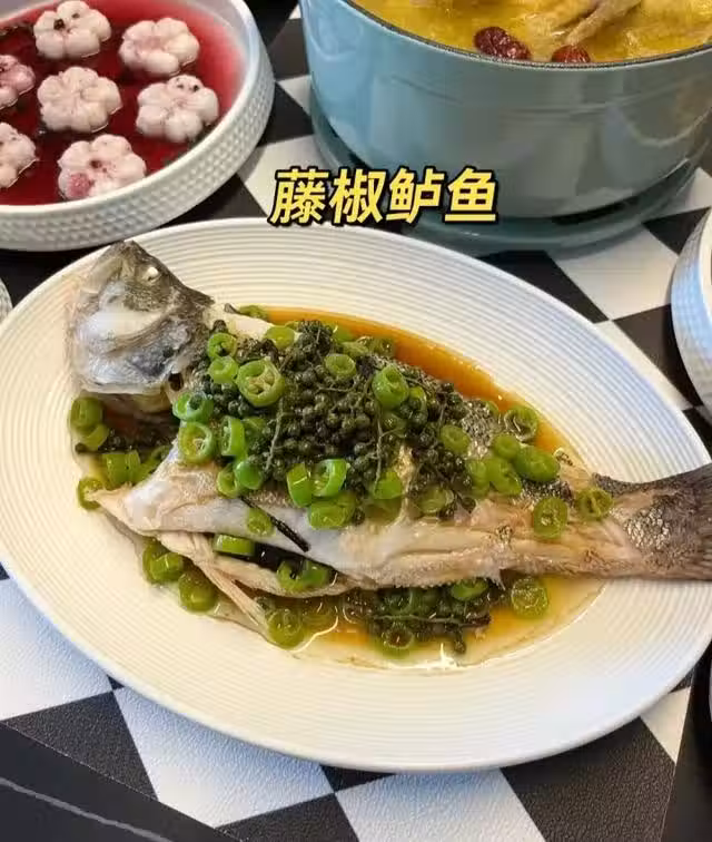 第三步,冷鍋熱油,把藤椒爆香,澆在鱸魚上。