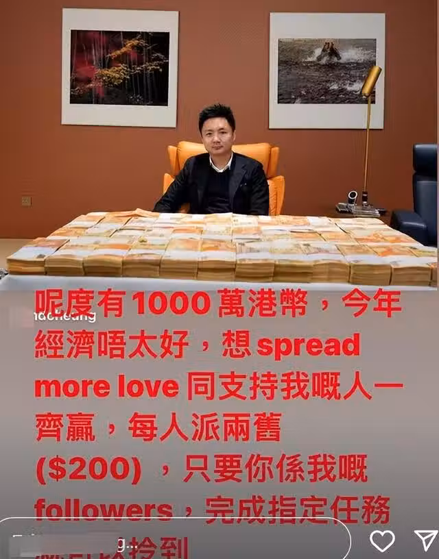「香港王思聰」曬1000萬現金宣布發錢!每人可領兩百,網友竟嫌少