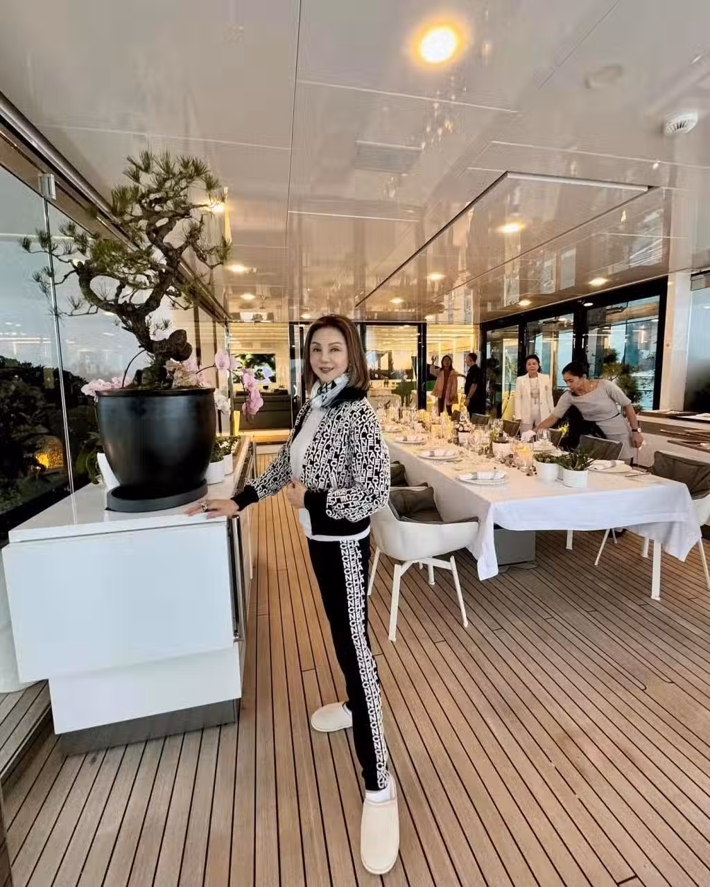 名媛謝玲玲與兒子出海!豪華遊艇擺鋼琴巨型餐桌,甲板能停直升機