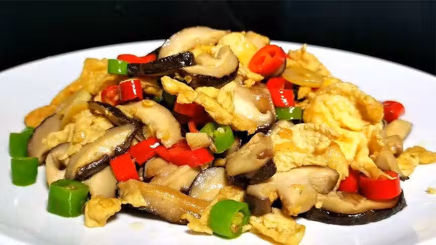 將香菇改刀切成薄片,然後放入開水中焯熟,撈出備用。熱鍋加油,煎雞蛋切小塊,再下蔥蒜和小米辣炒香,加入香菇、青紅椒等配料,最後加入鹽、生抽、蠔油等調味料,翻炒均勻即可。
